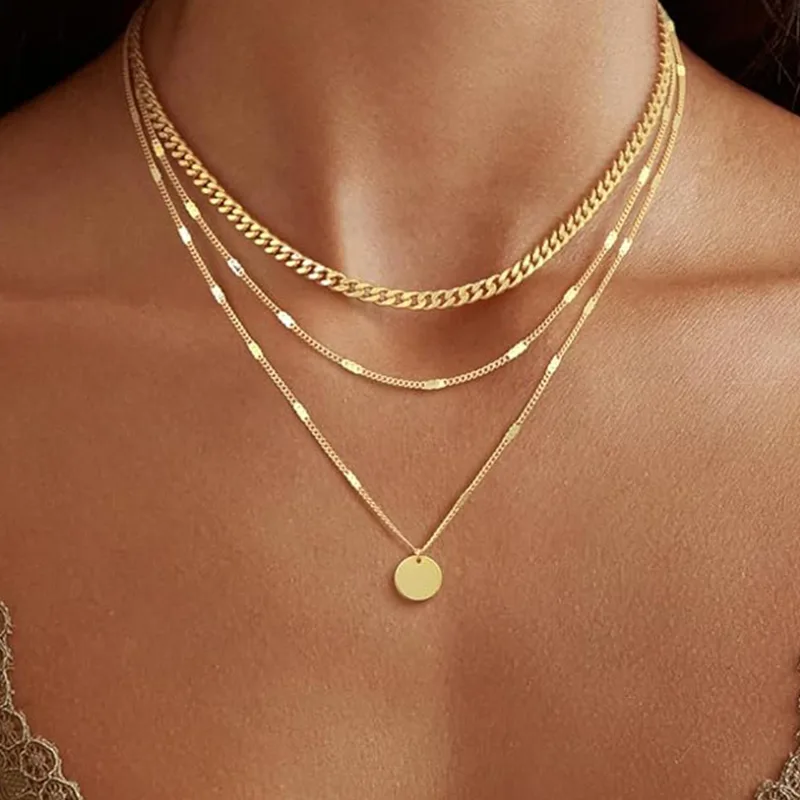 Le collier tendance pour femme en plaqué or contient trois modèles différents de colliers, à savoir la chaîne cubaine, la chaîne pointue et la chaîne pièce de monnaie, qui peuvent être portées séparément ou empilées. La chaîne cubaine courte de 13,8 pouces (5 mm de large) est rétro et exquise, la chaîne à pendentif pointu moyenne de 15 pouces est simple et soignée, et la longue chaîne de pièces de monnaie de 17 pouces est polyvalente et élégante. Les trois styles se complètent, créant un fort sentiment de superposition lorsqu'ils sont empilés, et chacun a son propre charme lorsqu'il est porté seul.